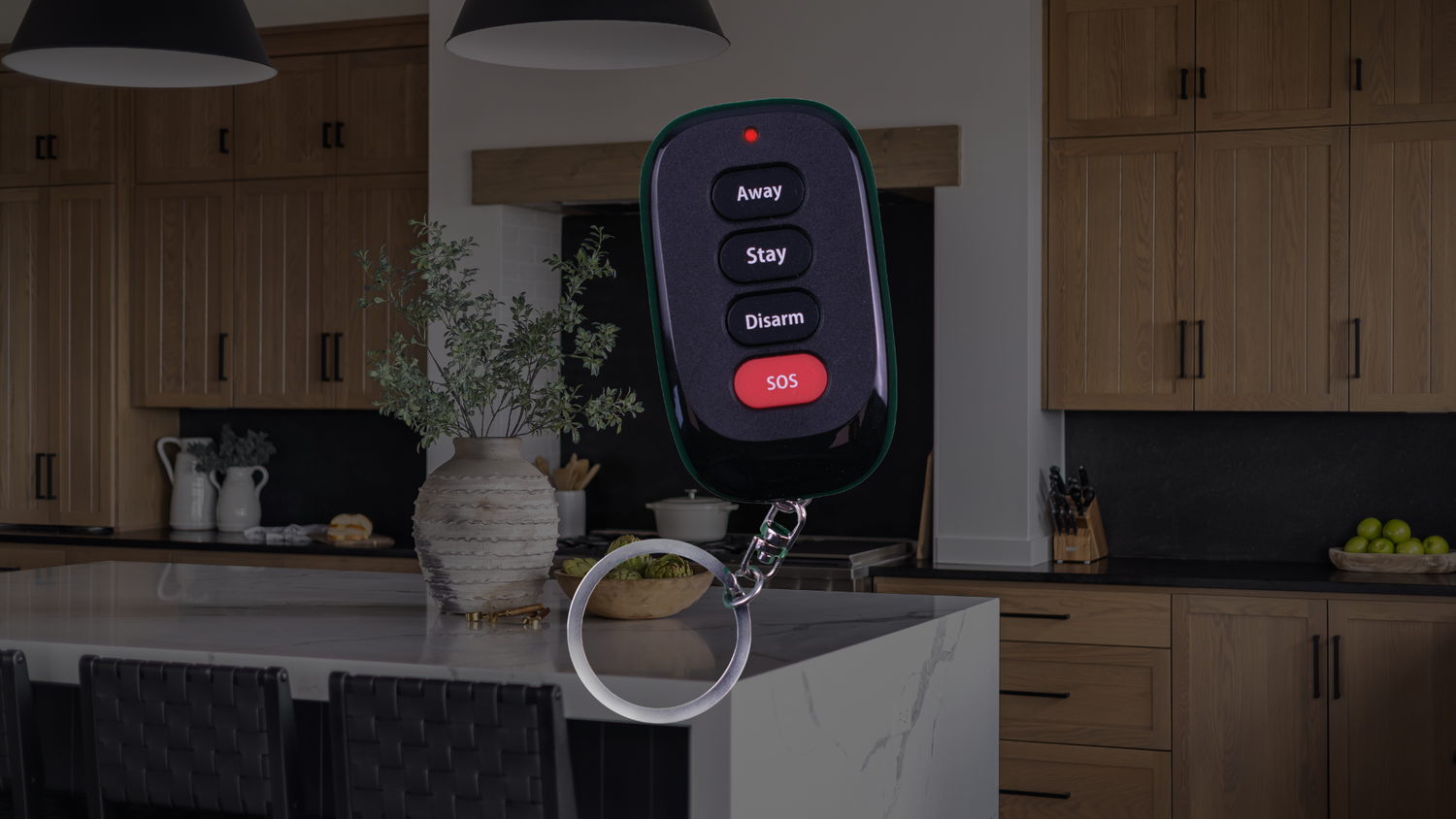 The compact, wireless Multi-Button Keyfob sends commands to a security panel with the press of a button. Its four buttons control Arm Away, Arm Stay, Disarm, and SOS functions, and it has a range of up to 820 feet in open air.